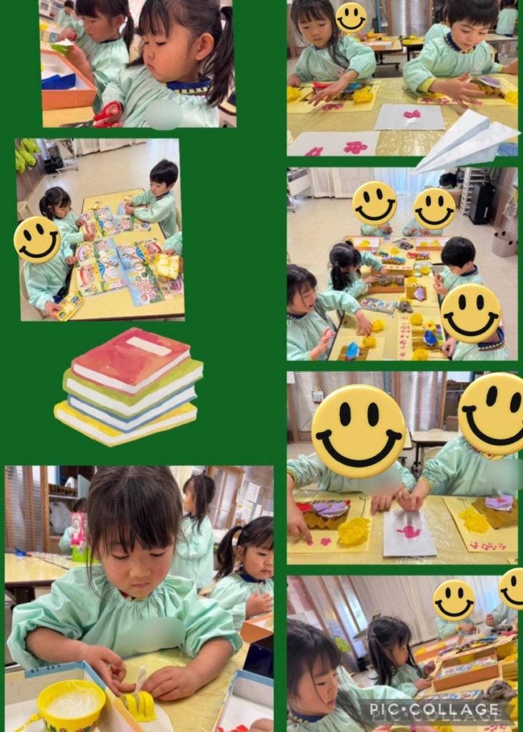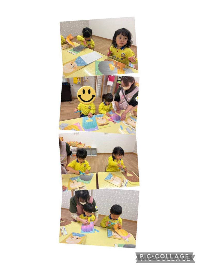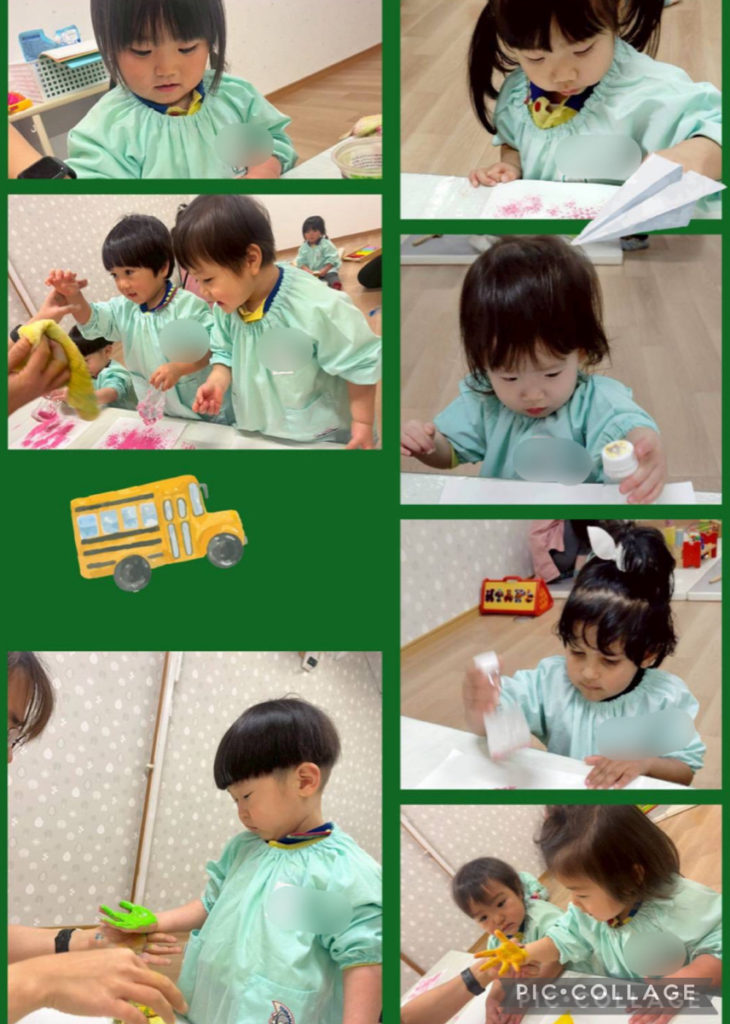 2歳児さんもできることが増えてきて制作活動に意欲的に取り組んでいます。