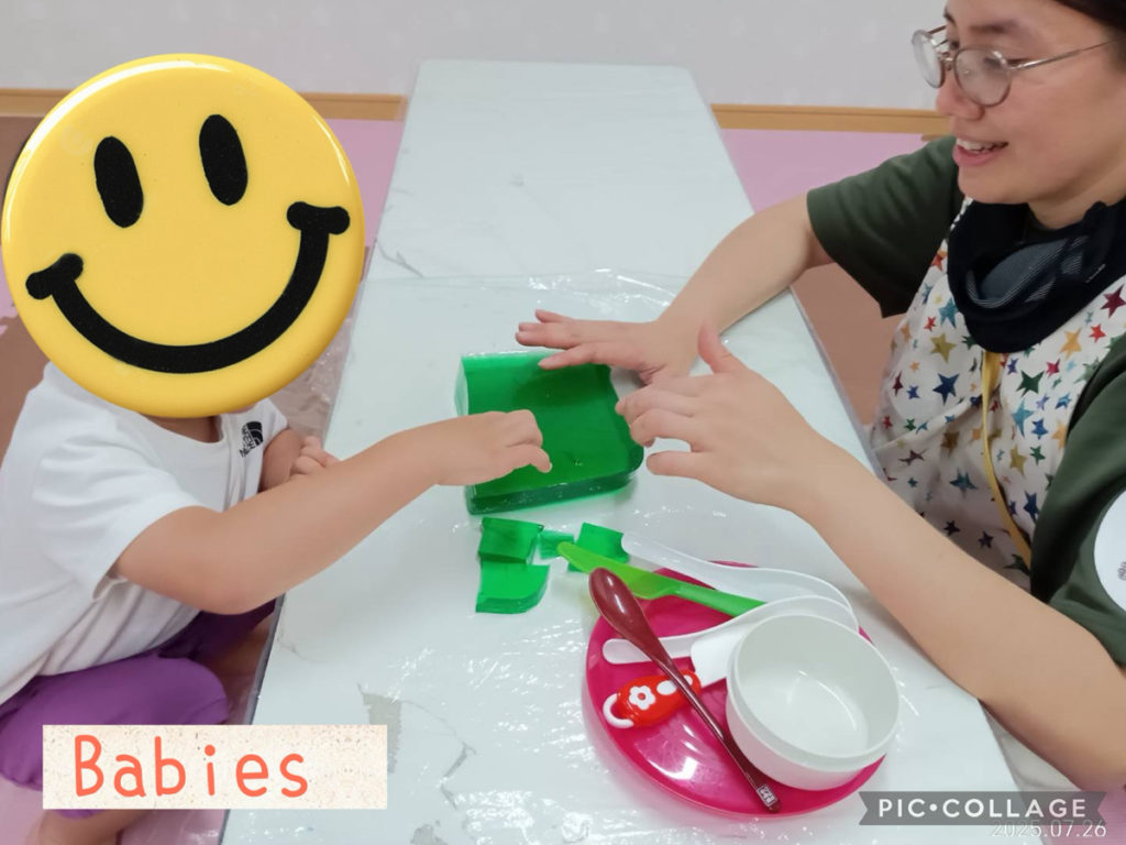 ゼリーを使って遊びました✨ゼリーを手でつかんだり、道具を使って形を変えたりして遊びました!