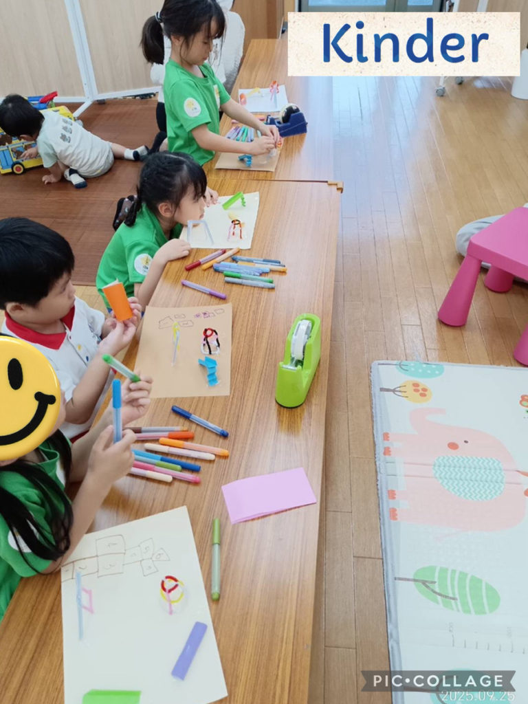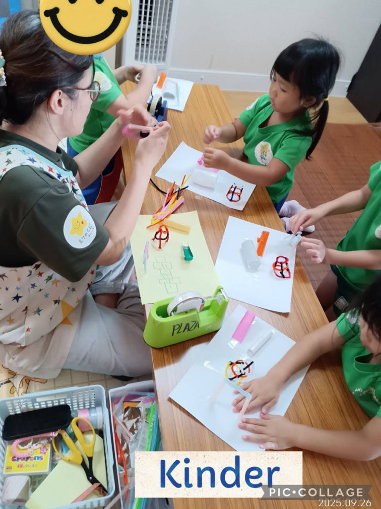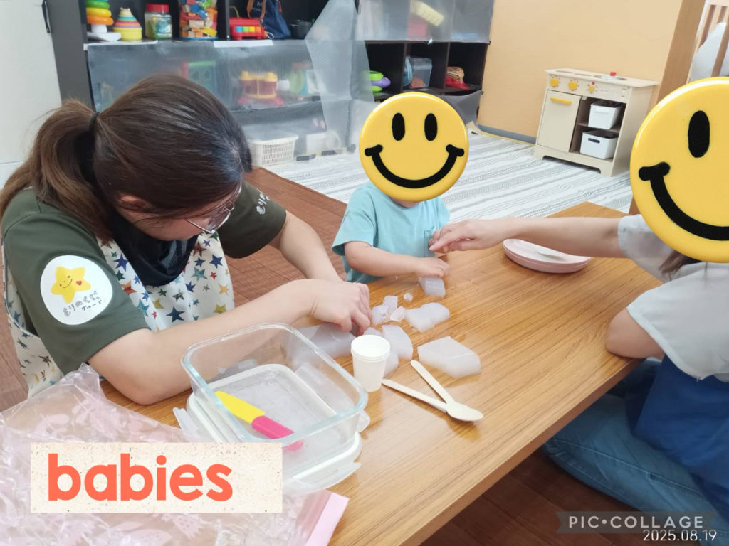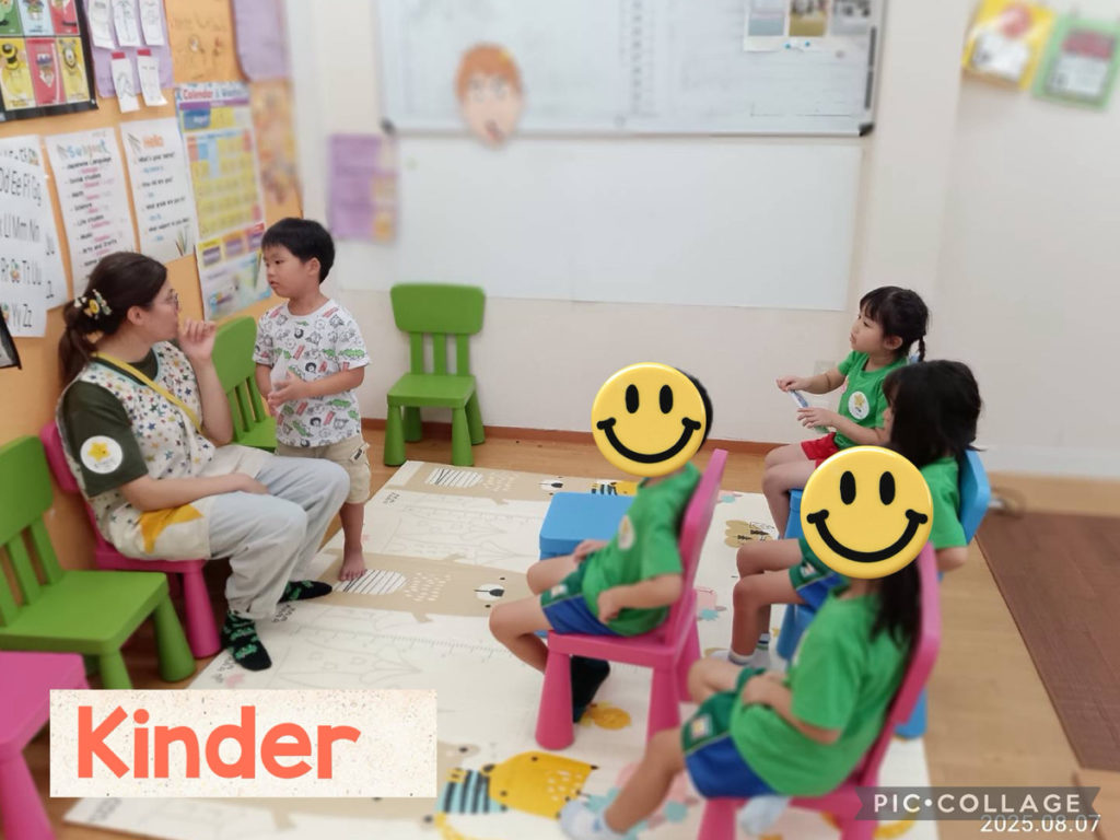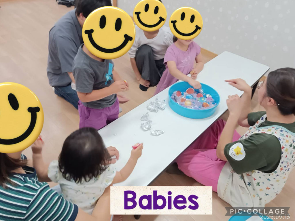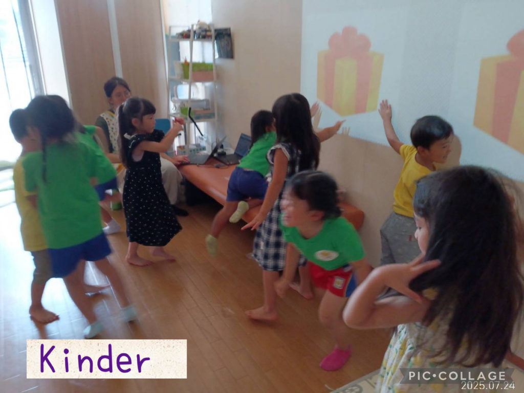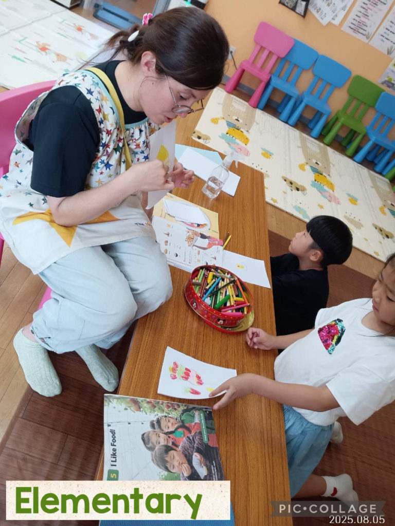アイスクリームの工作をしました。それから海の生き物の歌やアイスキャンディーの歌など、たくさんの歌を歌いました。最後に読み聞かせとアルファベットパズルもしました!