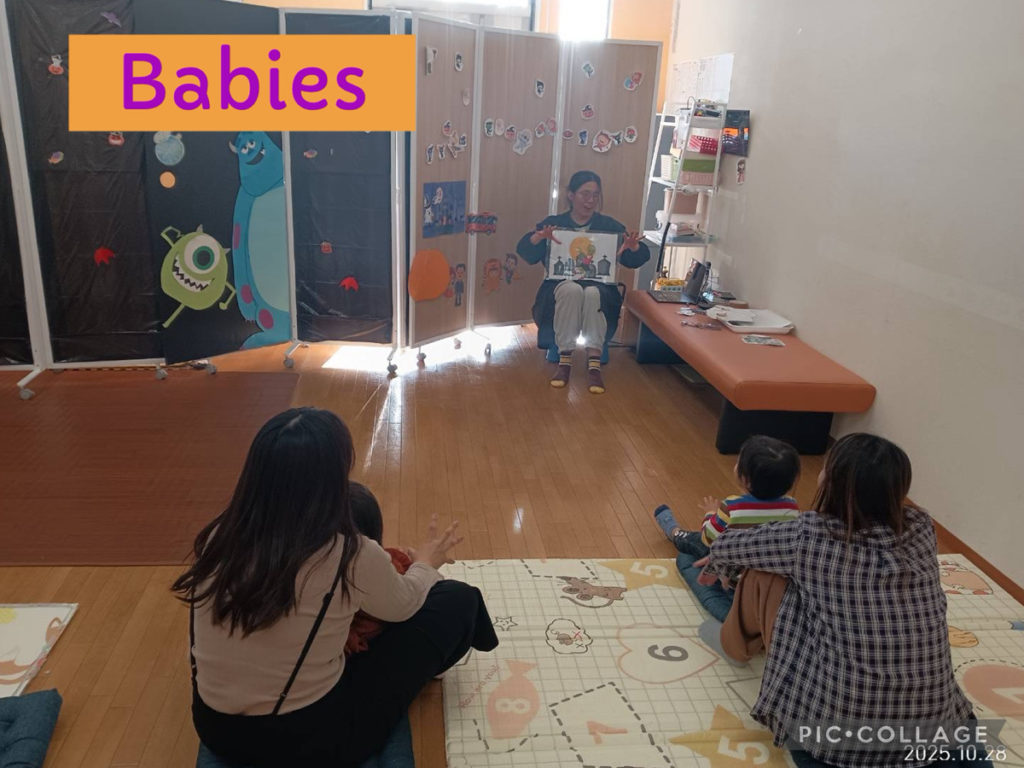 翼をもらった子ども達は”Sparrow song”に合わせてママやパパと一緒に踊りながら、空を飛んでいるかのように抱っこしてもらって遊びました。 そして5人のオバケのお話を聞いて、どんな色かな?と当てっこもしました。幼児: