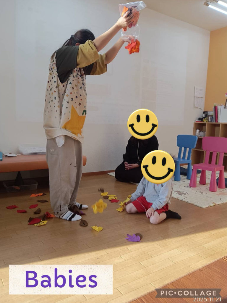 落ち葉でたくさん遊びました!そのあと、みんなで “秋の色” についてお話ししました🍂✨