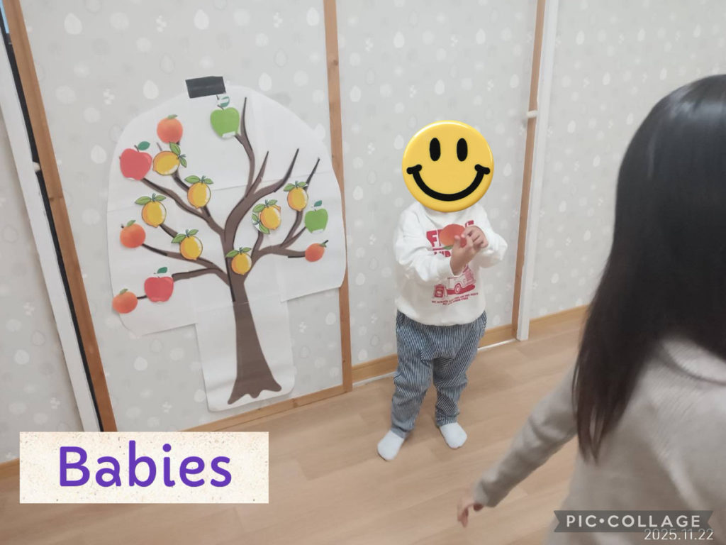 木からいろんな種類のフルーツを収穫して楽しみました!そのあとは落ち葉の感覚遊びで大盛り上がり上からひらひら落ちてくる葉っぱを、みんな上手にキャッチして楽しんでいました